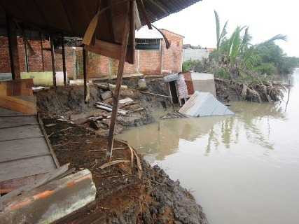 Tại hiện trường gần 250m2 của căn nhà bị dòng nước nhấn chìm. Căn nhà chỉ còn trơ lại phần mặt tiền cùng nhiều mảnh bê tông vương vãi trên mặt. Trên sàn nhà có nhiều vết rạn nứt, lòng sông ăn sâu vào mặt đất tạo thành những hàm ếch có thể nhấn chìm phần còn lại bất cứ lúc nào.