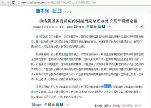 Tân Hoa Xã, hãng thông tấn nhà nước Trung Quốc đăng tải nội dung trả lời của ông Dương Khiết Trì, Ủy viên Quốc vụ viện trong cuộc điện đàm với Phó Thủ tướng Phạm Bình Minh của Việt Nam.