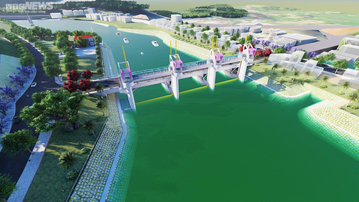 Đập dâng có cửa van điều tiết sử dụng cống hở bằng BTCT M300 gồm 3 khoang, chiều rộng thông nước mỗi khoảng 25m.