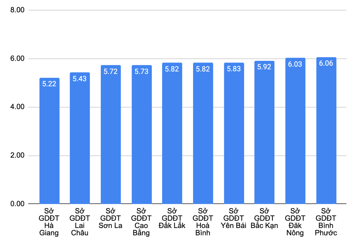 Môn Ngữ văn: Ba địa phương Hà Giang, Lai Châu, Sơn La có điểm trung bình môn này thấp nhất cả nước, lần lượt là 5,22; 5,43 và 5,72.