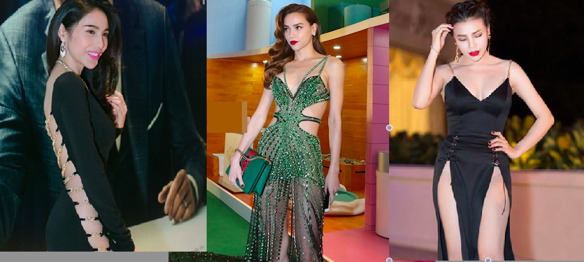 Chẳng hề thua kém đàn chị, cách đây 2 tuần, Hoa hậu Việt Nam 2014 khiến fan "chao đảo" một phen vì diện bộ đầm đen táo bạo của NTK Chung Thanh Phong đi dự sự kiện. Chiếc đầm không chỉ khoét sâu phần ngực tới tận eo, mà còn được thiết kế xẻ tà cao kết hợp những khoảng hở kéo dài từ vai xuống tới dọc hông, xuyên thấu.