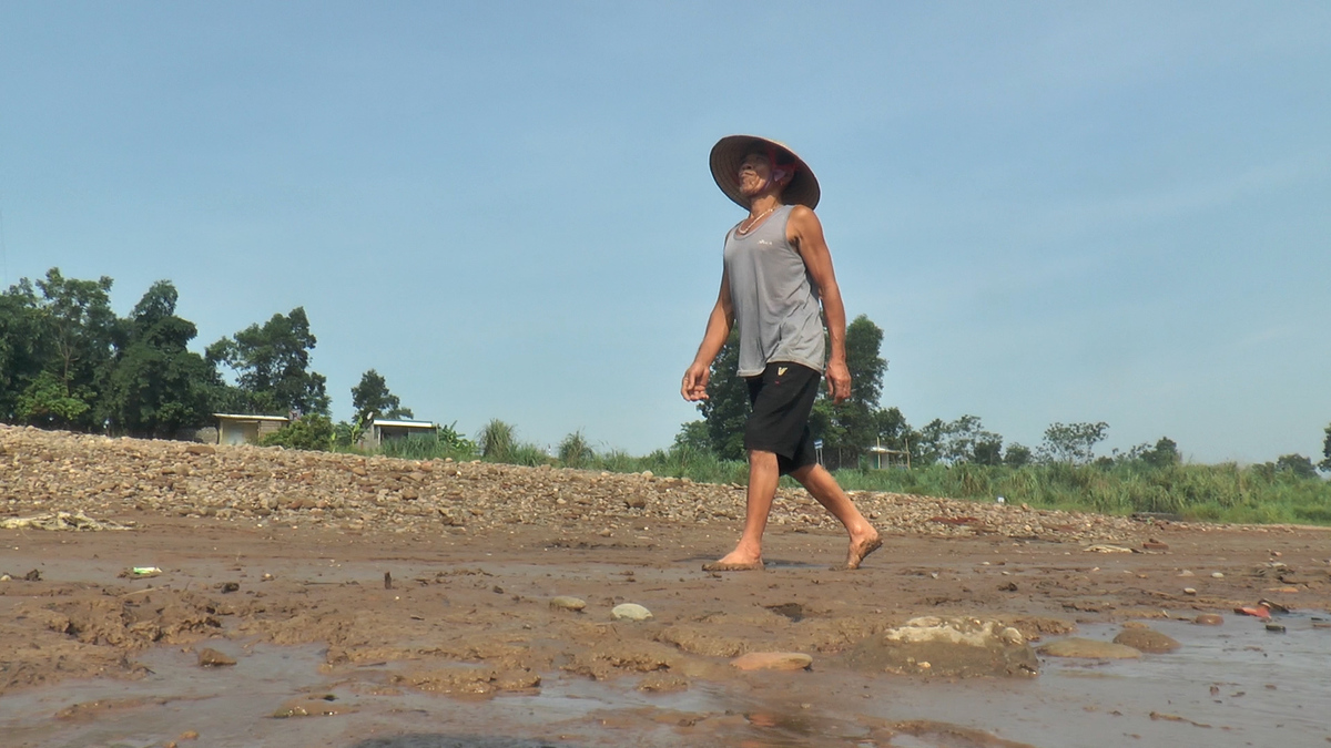 Do ảnh hưởng nắng nóng, ít mưa đã khiến mực nước vùng hạ du hồ thủy điện Hòa Bình khô cạn, người dân có thể đi bộ qua sông Đà.