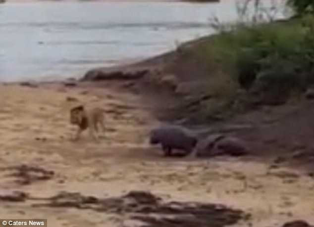 Hà mã con liều mạng đuổi đánh con sư tử đực đang lăm le ăn thịt hà mã mẹ ốm yếu, đoạn clip được quay tại Vườn Quốc gia Kruger, Nam Phi.