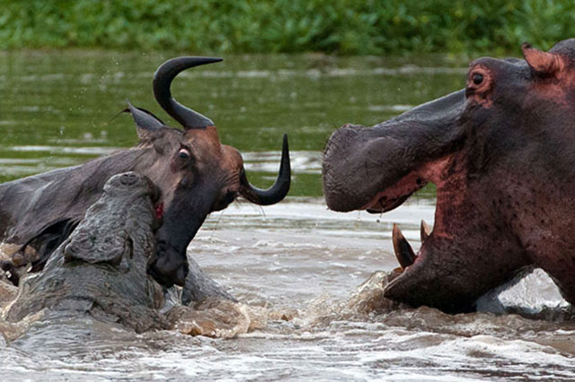 Ban đầu, những người chứng kiến cứ nghĩ hà mã sẽ tấn công cá sấu, giúp linh dương đầu bò thoát chết. Tuy nhiên, điều bất ngờ xảy ra khi nó lại giúp “gã bò sát” khổng lồ hạ gục con mồi.