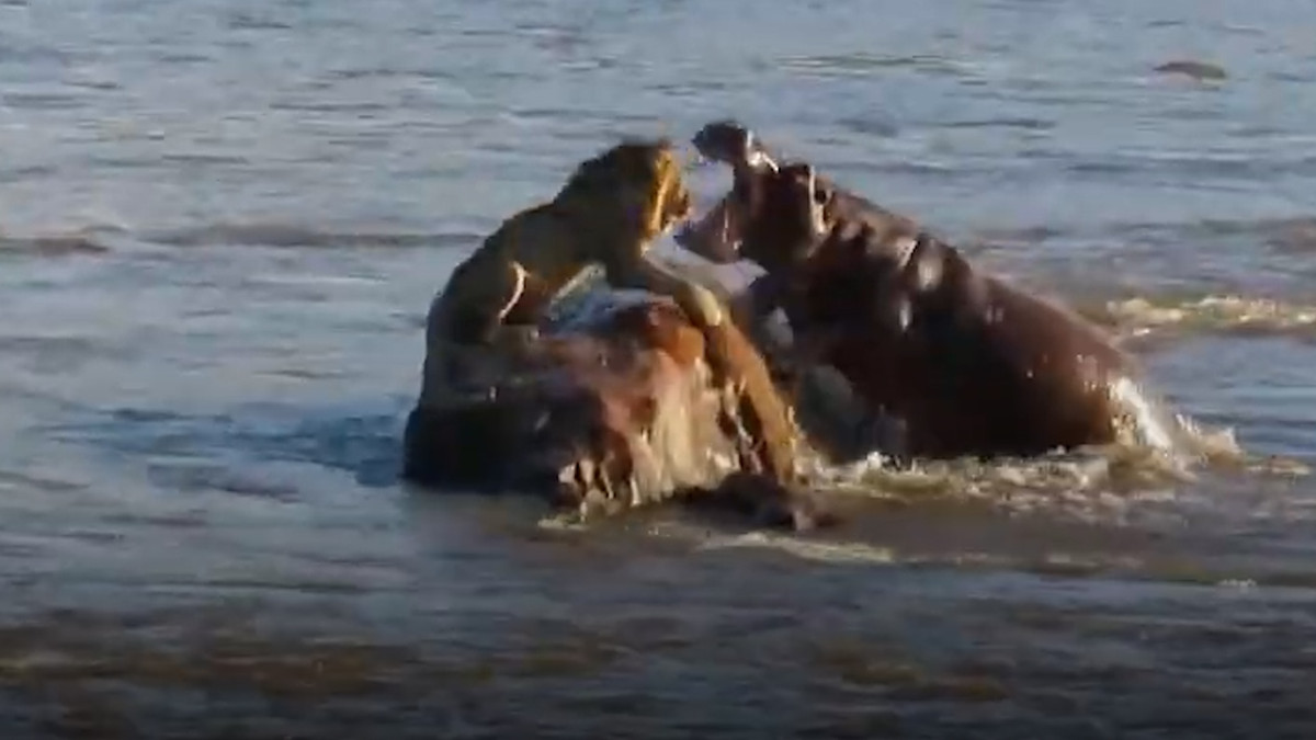 Hà mã tấn công khiến sư tử hoảng loạn nhảy vọt xuống sông