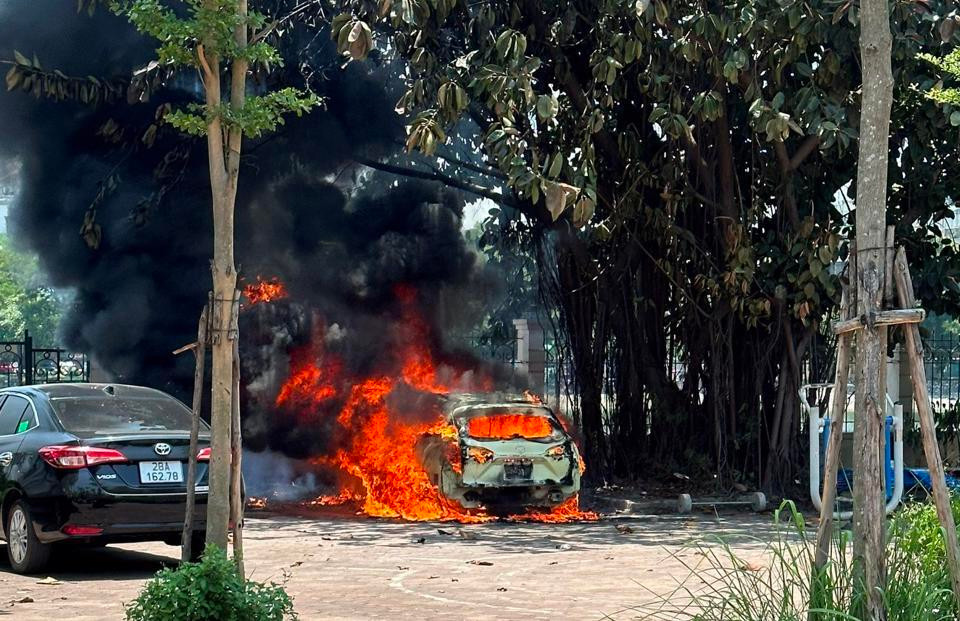 Ô tô cháy ngùn ngụt khi đỗ ở khuôn viên của Trung tâm thể dục thể thao quận Ba Đình.