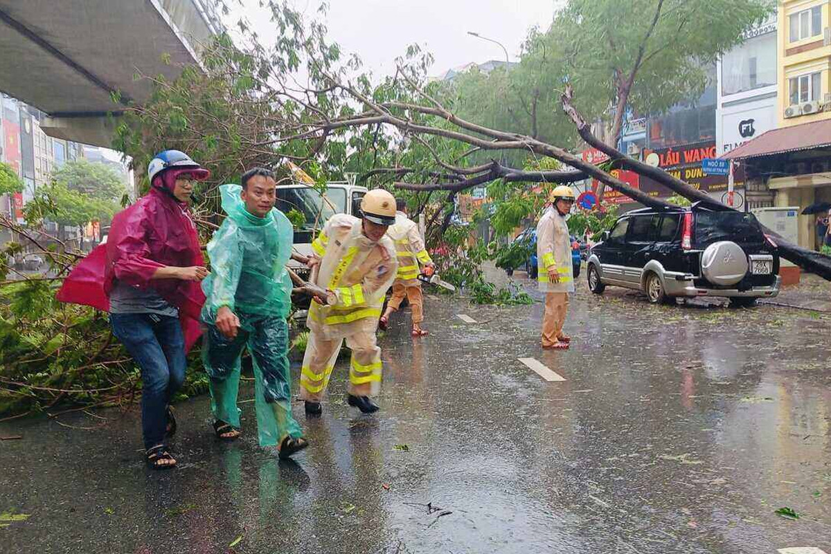 Cảnh sát giao thông hỗ trợ người dân gặp nạn do cây đổ trên đường Hồ Tùng Mậu (quận Cầu Giấy, Hà Nội) chiều 7/9.