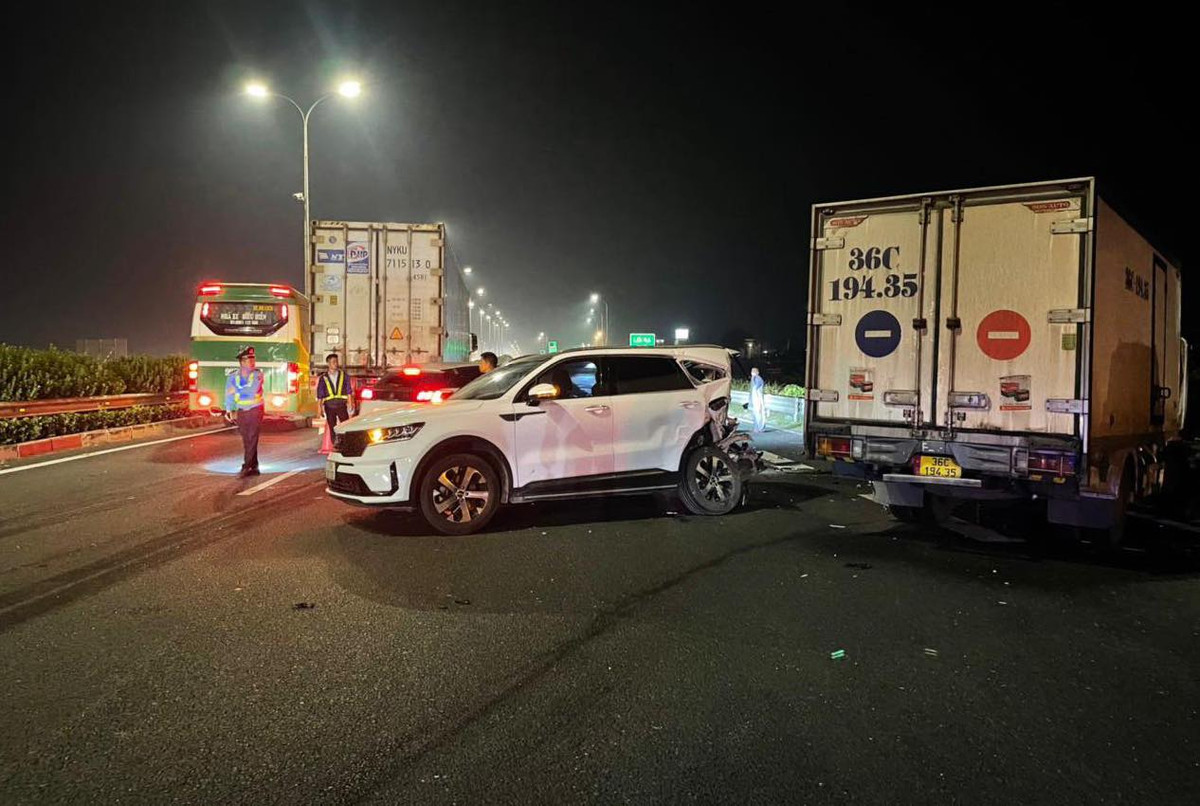 Tại hiện trường, xe tải mang BKS 36C-194.XX do V.Đ.V. (SN 1986, trú tại Thanh Hóa) điều khiển đâm vào dải phân cách bên phải trên tuyến cao tốc, sau đó là tai nạn liên hoàn. Xe con hiệu KIA do anh L.V.T. (SN 1990, trú tại Kiến Xương, Thái Bình) điều khiển, bị biến dạng phần đuôi. Xe đầu kéo mang BKS 77C- 078.XX do tài xế P.Đ.T. (SN 1970, trú tại Quy Nhơn) điều khiển, tông lõm thân một ô tô hiệu Peugeot.