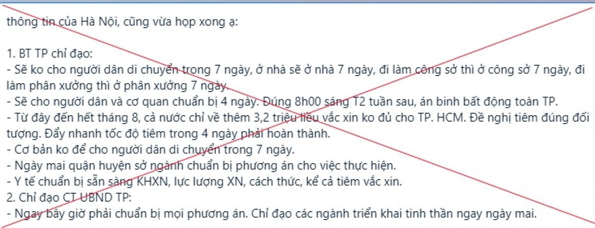 Ngày 20/8, lãnh đạo Sở Thông tin và Truyền thông Hà Nội cho biết, thông tin thành phố chỉ đạo không cho người dân di chuyển trong 7 ngày là sai sự thật.
