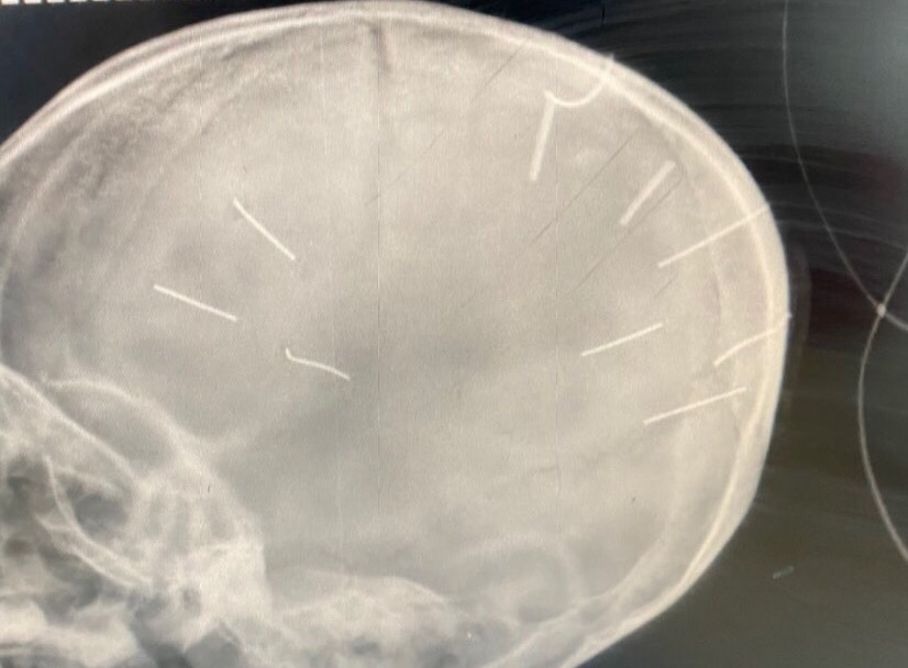 Hình ảnh phim chụp cho thấy hộp sọ của bệnh nhi có 9 đinh. (Ảnh: BVCC)