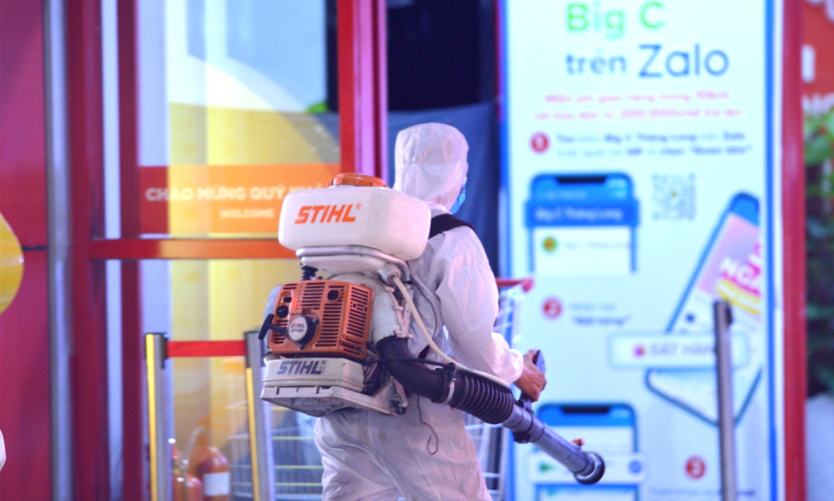 Nhân viên y tế phun khử khuẩn tại TTTM BigC Thăng Long.