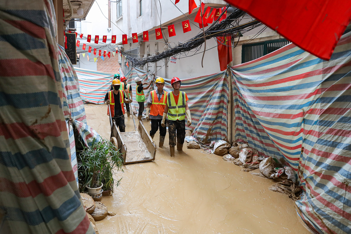 Các tấm ván được vận chuyển vào để ngăn bùn.