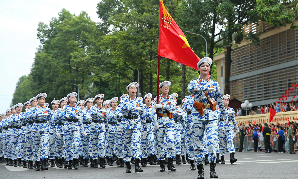 Khối nữ sĩ quan Quân y diễu hành trên phố Hà Nội sau buổi tổng duyệt sáng 30/8.