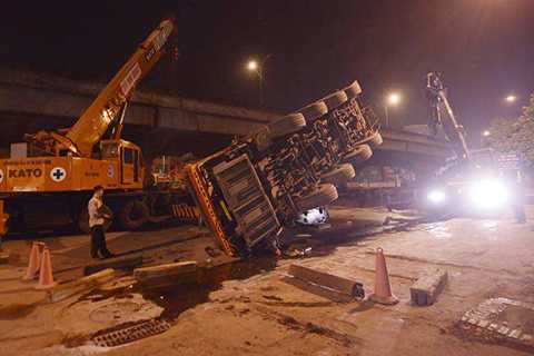 | Chiếc xe cẩu cỡ lớn đổ sập chắn ngang đường Nguyễn Xiển |