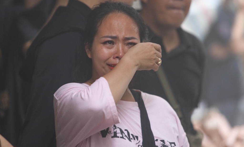 Người phụ nữ sợ hãi bật khóc sau khi được giải cứu khỏi đám cháy.