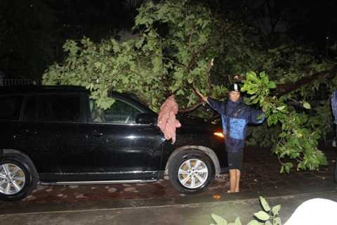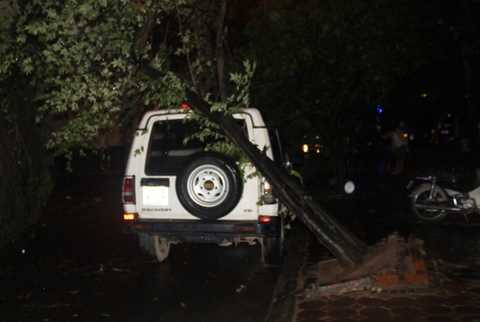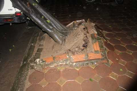 | Cây xanh bật gốc đổ vào ô tô đỗ dưới lòng đường |