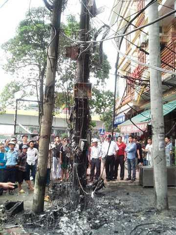 | Cột điện phía trước căn nhà số 5, Nguyễn Khang bị cháy đen |