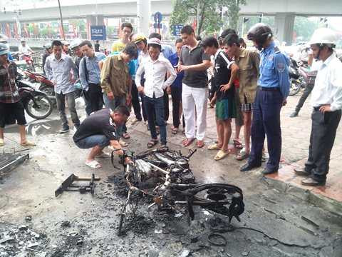 Lúc này, chiếc xe máy mang BKS 99H4 – 4061 đỗ phía dưới cột điện đã bị ngọn lửa bén, thiêu rụi hoàn toàn.