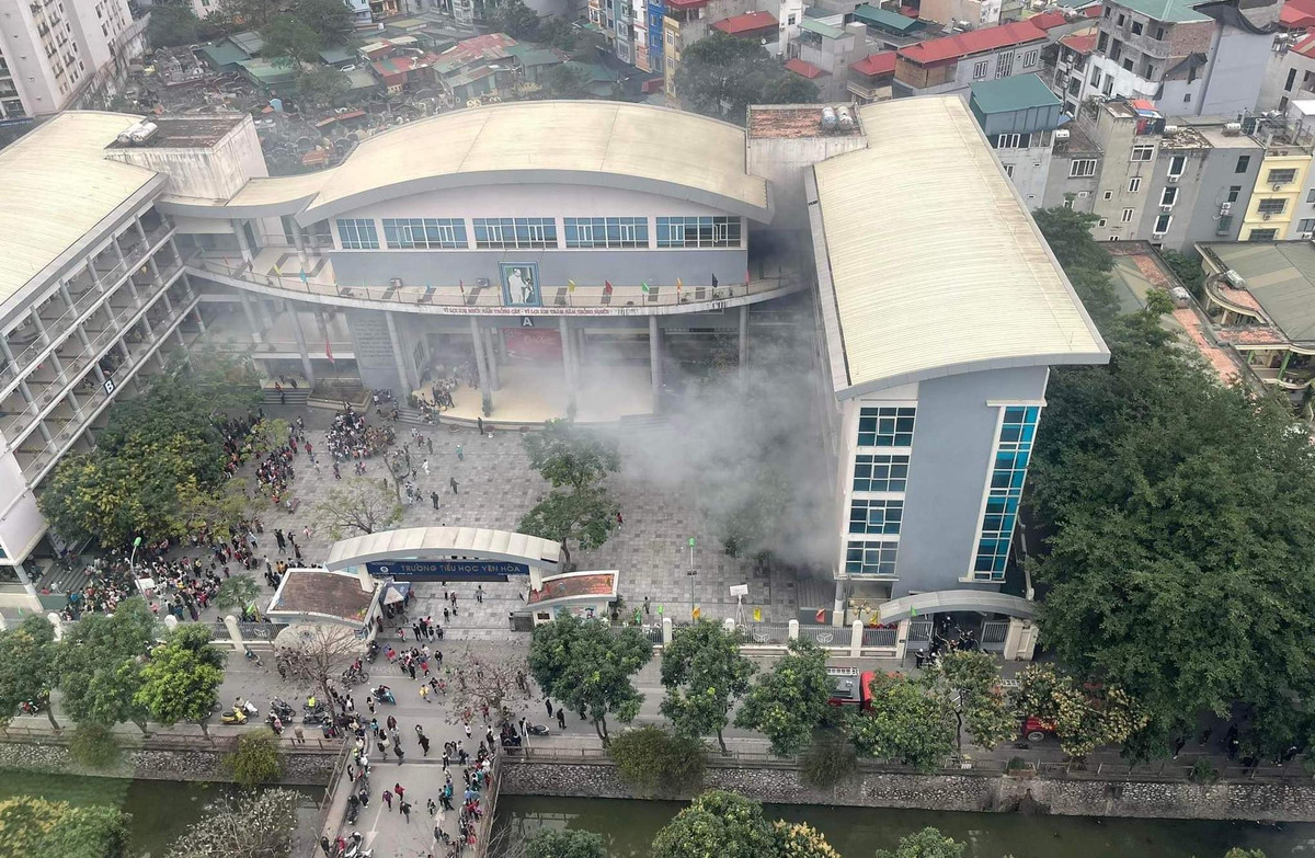 Khói bốc ra từ bên trong trường Tiểu học Yên Hoà.