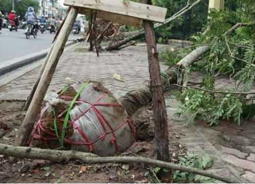 Sau cơn giông lớn chiều 13/6 tại Hà Nội, nhiều cây xanh vừa được trồng thay thế đã bị đổ ngổn ngang. Đáng chú ý, một số cây bị đổ này phần gốc vẫn được bọc kín bằng lưới và buộc bằng những sợi dây gai đỏ.