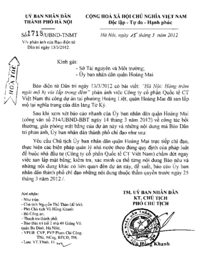 Công văn này do Phó chủ tịch UBND TP Vũ Hồng Khanh ký gửi Sở Tài nguyên và Môi trường, UBND quận Hoàng Mai yêu cầu làm rõ những việc báo chí nêu.