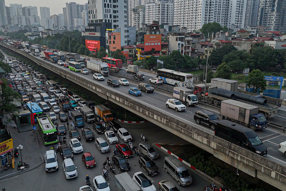 Đường Vành đai 3 trên cao, đoạn từ Khuất Duy Tiến đến tòa nhà Thăng Long Number 1, cũng thường xuyên rơi vào cảnh "chôn chân" do lượng xe từ trung tâm đổ dồn ra ngoại thành.