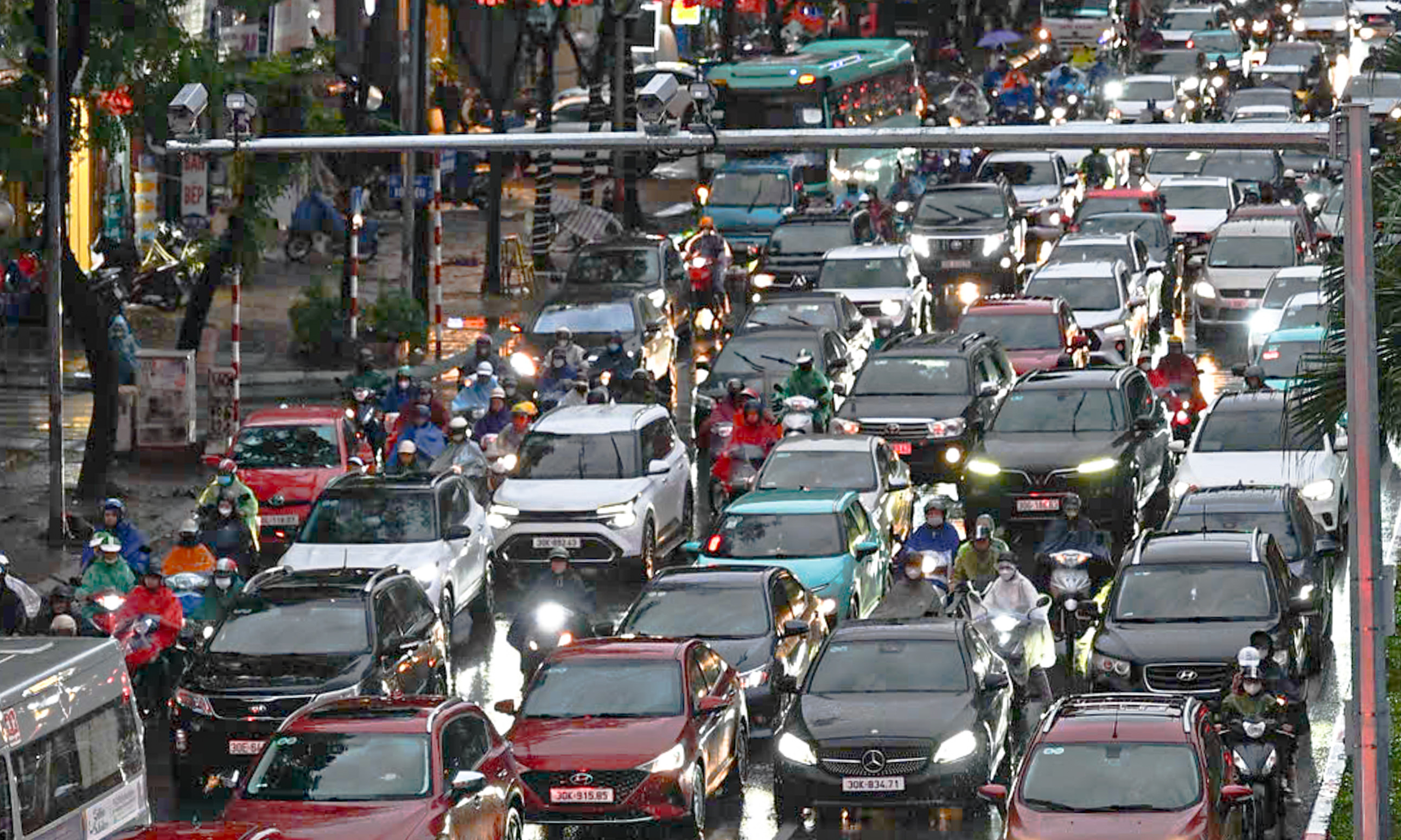 Đến 19h cùng ngày, nhiều tuyến đường vẫn bị ùn cục bộ, các phương tiện chỉ có thể nhích từng mét một dưới làn mưa phùn.