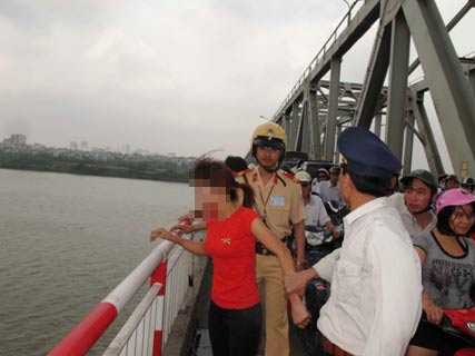 | Cô gái nhảy cầu tự tử được cảnh sát và bảo vệ cầu cứu sống. |