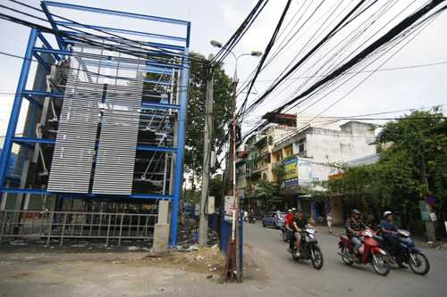 | Khu vực bãi đất trống trên đường Nguyễn Công Trứ được chọn làm nơi lắp đặt giàn đỗ xe bằng thép. Sau khi lắp đặt xong sẽ được di chuyển sang các con phố khác. |