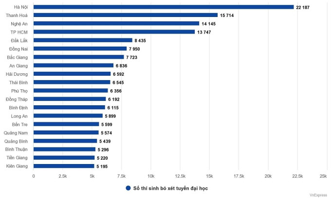 Xét riêng các tỉnh thành, Hà Nội là địa phương có số thí sinh bỏ đăng ký xét tuyển cao nhất cả nước với 22.187 thí sinh, tiếp đến là Thanh Hoá 15.714, Nghệ An 14.145, TP.HCM 13.747, Đắk Lắk 8,435...