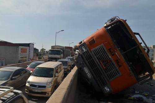 Theo một số nhân chứng, vào thời điểm trên, chiếc xe container mang BKS 16H-4469 chạy trên đường cao tốc trên cao hướng từ Linh Đàm về Mai Dịch, khi đi đến khu vực bất ngờ bị mất lái rồi lao thẳng lên dải phân cách cứng giữa đường cao khoảng 1 mét rồi lật nghiêng.