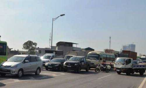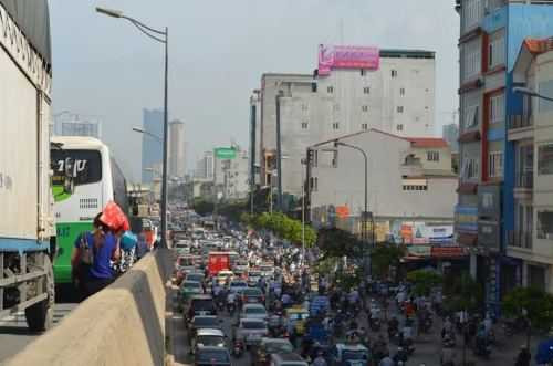 | Các phương tiện lưu thông ở đường trên cao phải dồn xuống đường Khuất Duy Tiến gây nên cảnh ùn tắc nghiêm trọng |
