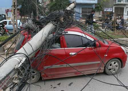 Vào thời điểm trên, anh Ngô Văn Tuấn lái xe Kia Morning từ siêu thị Big C đi khu đô thị Dịch Vọng. Khi đến trước cửa số nhà 126 phố Trung Kính, bất ngờ một cột điện đổ trúng nóc xe.