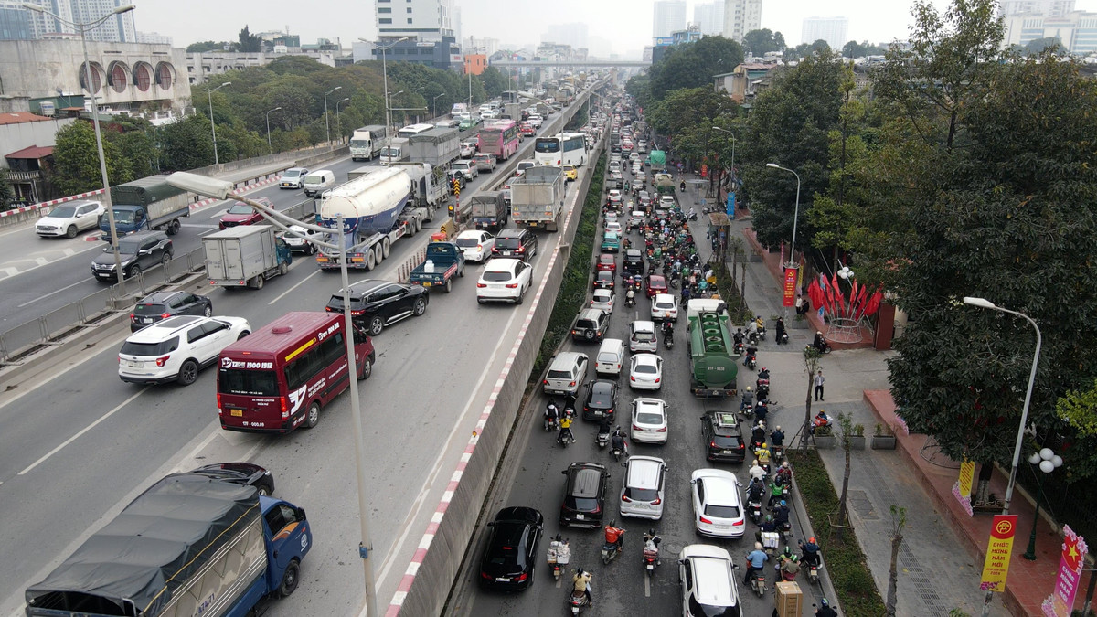 Sáng 5/2, (tức 26 tháng Chạp) nhiều người đổ về quê đón Tết khiến các tuyến đường cửa ngõ Hà Nội ùn tắc kéo dài.
