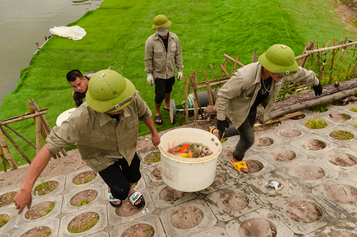 Khoảng 2 tấn cá Koi còn lại, có trọng lượng 1-1,5kg/con, với nhiều chủng loại, màu sắc khác nhau được chuyển sang khu vực thung lũng hoa Hồ Tây.