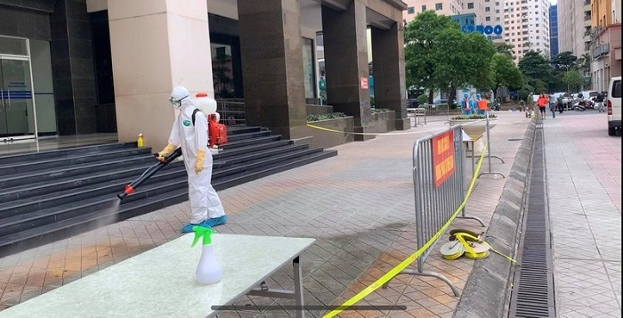 Chiều cùng ngày, quận Cầu Giấy huy động hàng chục cán bộ xuống hiện trường để phun khử trùng toàn bộ tòa nhà và đặc biệt tại tầng 26 nơi bệnh nhân sinh sống.