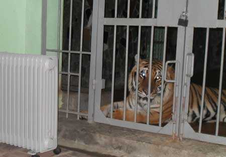 Lúc là khách tham quan, tôi chỉ được ngắm những chú hổ này khi đứng bên ngoài hàng rào an toàn. Còn hổ sẽ nhởn nhơ đi lại bên trong vương quốc của mình mà nếu may mắn, hổ tiến sát đến hàng rào sắt thì khách tham quan mới được nhìn ngắm chúa sơn lâm gần hơn. Thế nên, khi được ở cạnh các chú hổ với cự ly ngắn, tôi có cảm giác rất lạ. Thế mà thấy người lạ lại gần, mấy chú hổ vẫn không có phản ứng gì. Các chú nằm dài, mặt hướng vào chiếc máy sưởi đang tỏa hơi ấm. Mỗi chú nằm ở một ngăn và đều có một cái máy sưởi để cho riêng mình.