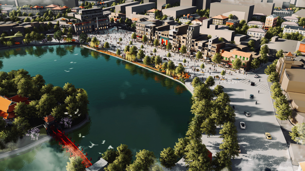 Phối cảnh Quảng trường Đông Kinh Nghĩa Thục, trục Đinh Tiên Hoàng nhìn từ phía Đông hồ Hoàn Kiếm