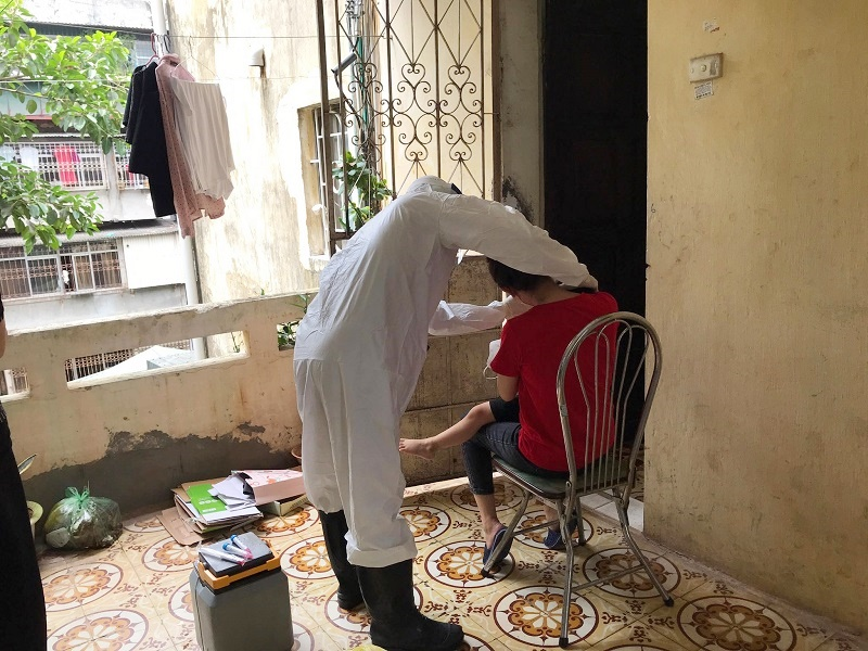 Trung tâm Y tế quận Hai Bà Trưng lấy mẫu xét nghiệm cho vợ con của BN962. (Ảnh: Kinhtedothi)
