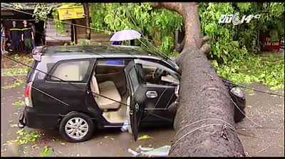 ô tô bị cây đè bẹp trên phố Núi Trúc