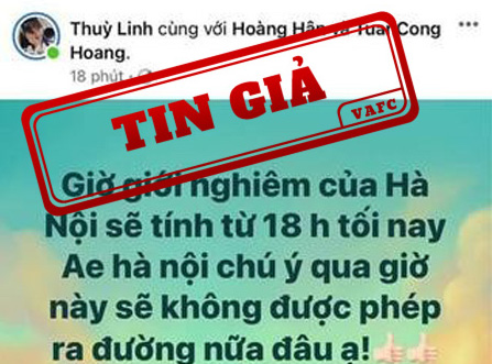 Trước đó, tài khoản Facebook “Thùy Linh” đăng tải thông tin “Giờ giới nghiêm của Hà Nội sẽ tính từ 18h tối nay”. Theo Sở Thông tin và Truyền thông Hà Nội, chưa hề có lệnh giới nghiêm được ban bố đối với Hà Nội.