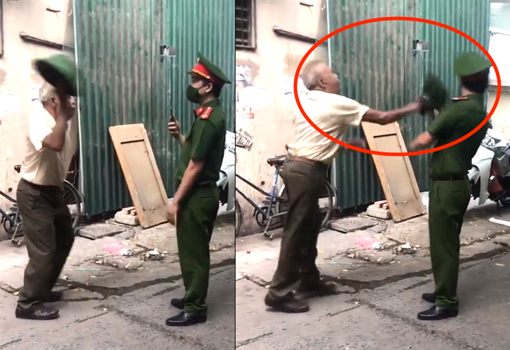 Trước đó, mạng xã hội chia sẻ đoạn video ghi lại hình ảnh một cụ ông dùng mũ cối đánh thẳng vào mặt cán bộ công an khi bị nhắc nhở đeo khẩu trang.