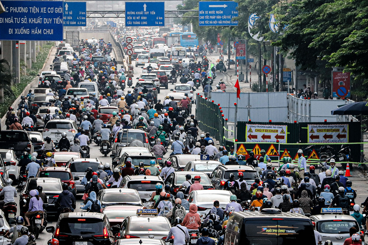 Dòng xe cộ nối đuôi nhau trên tuyến đường huyết mạch của Hà Nội.