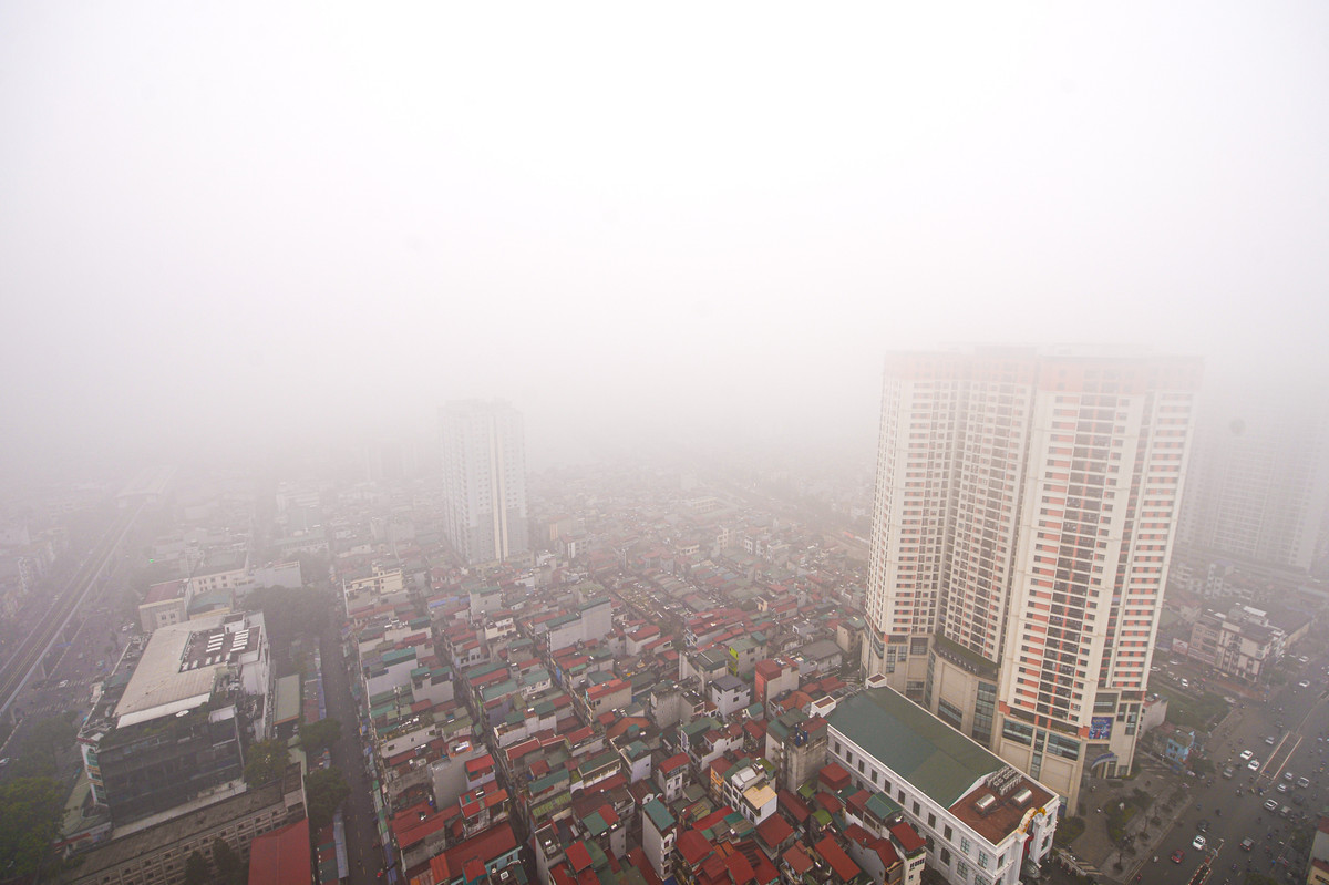 Đến 10h, sương tan dần nhưng trời vẫn còn khá mù do thiếu ánh nắng. Dãy toà nhà cao tầng trên đường Yên Phụ vẫn chìm trong làn sương mờ.
