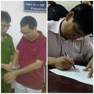 | Nguyễn Việt Hà (áo đỏ) và Nguyễn Huy Vui đang kí biên bản chấp hành lệnh bắt giam tại trụ sở Công ty CP Đầu tư Quang Tấn. |