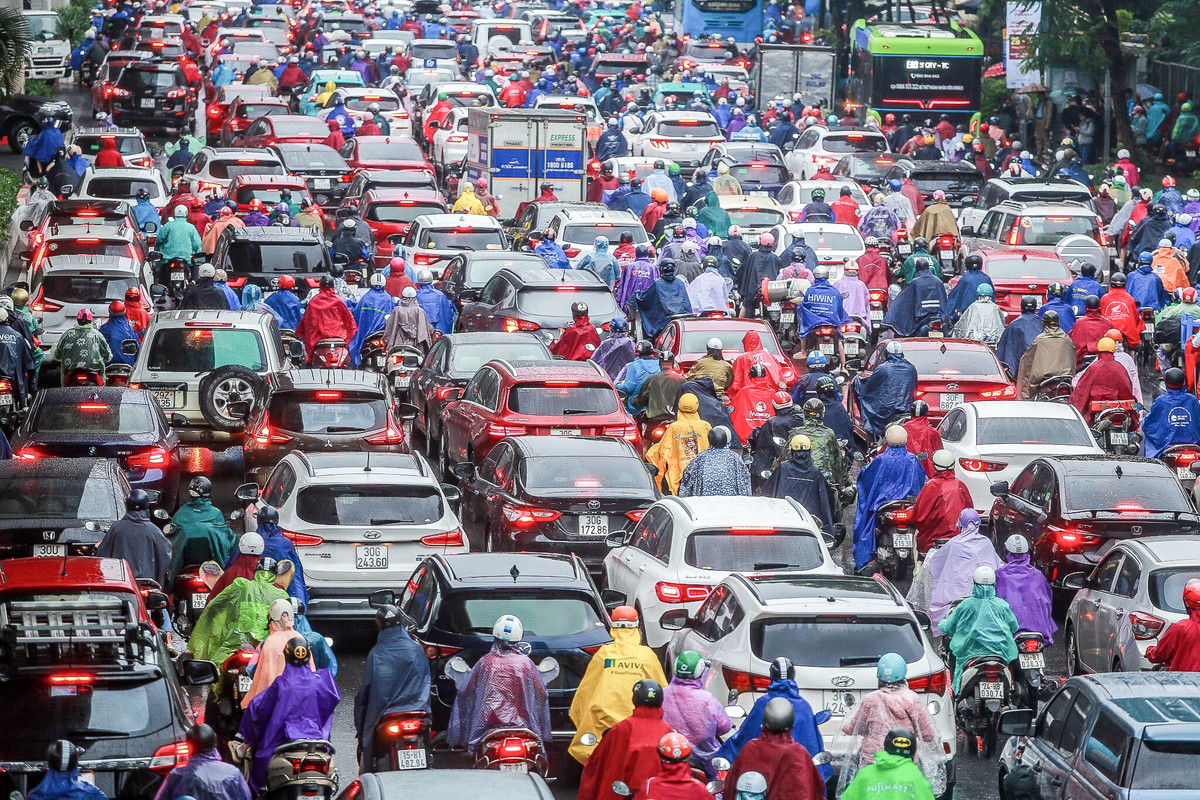 Mưa lớn kèm tắc đường khiến người tham gia giao thông vất vả di chuyển, nhiều người đi gần 2 tiếng mới đến nơi làm.