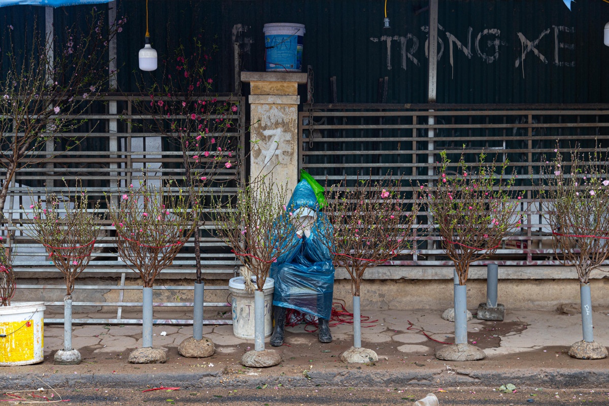 Người bán đào chịu rét đứng dưới mưa, thẫn thờ ngóng khách. Đào đã cắt khỏi gốc, không bán nhanh sẽ sớm hỏng nên bà rất lo lắng.