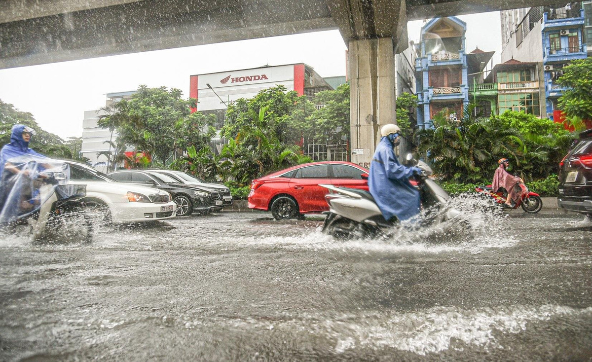 Mưa xối xả khiến nước ngập lênh láng trên đường Mỹ Đình (quận Nam Từ Liêm).