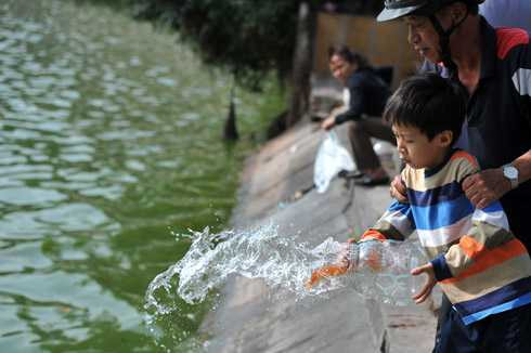 Khác với mọi ngày, Hồ Hoàn Kiếm hôm nay cũng trở nên đông đúc hơn. Suốt từ sáng đến chiều, lúc nào cũng có người mang cá đến để phóng sinh. Ông Phạm Đức Giang (quận Hoàn Kiếm, Hà Nội) cho biết, đã rất nhiều năm nay, cứ đến ngày Tết ông Công, ông Táo là ông lại mang cá ra hồ để thả. “Năm nay, tôi đưa các cháu đi thả cá cùng, kể chuyện về sự tích ông Táo cho chúng nó nghe. Các cháu tôi rất thích", ông Đức chia sẻ.