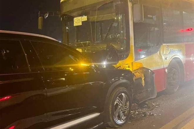 Tối 12/10, ô tô 7 chỗ di chuyển hướng Hai Bà Trưng - Long Biên đâm trực diện vào xe buýt tuyến 52B đi hướng ngược lại.